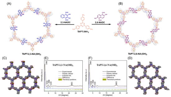 (A,B) Synthesis of (A) TAPT-2,3-NA(OH)2 and (B) TAPT-2,6-NA(OH)2 COFs. (C,D) Top-view crystal structures of (C) TAPT-2,3-NA(OH)2 and (D) TAPT-2,6-NA(OH)2 COFs. (C,D) Experimental and simulated PXRD patterns of (E) TAPT-2,3-NA(OH)2 and (F) TAPT-2,6-NA(OH)2 COFs.