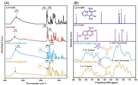 (A) FTIR spectra of 2,3-NADC, 2,6-NADC, TAPT-2,3-NA(OH)2, and TAPT-2,6-NA(OH)2 COFs. (B) 13C-NMR spectra of 2,3-NADC, 2,6-NADC and solid state 13C CP/MAS NMR spectra of TAPT-2,3-NA(OH)2 and TAPT-2,6-NA(OH)2 COFs. * Background peaks from the instrument.