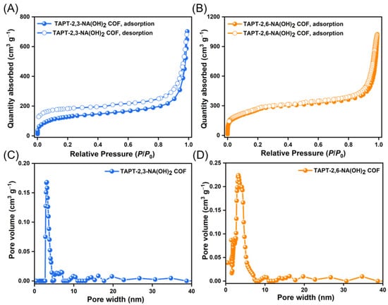 (A,B) N2 sorption isotherms recorded at 77 K of (A) TAPT-2,3-NA(OH)2 and (B) TAPT-2,6-NA(OH)2 COFs. (C,D) Pore size distributions of (C) TAPT-2,3-NA(OH)2 and (D) TAPT-2,6-NA(OH)2 COFs.