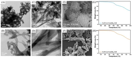 (A–D) TEM images of (A,B) TAPT-2,3-NA(OH)2 and (C,D) TAPT-2,6-NA(OH)2 COFs, measured at different magnifications. (E,F) FE-SEM images of (E) TAPT-2,3-NA(OH)2 and (F) TAPT-2,6-NA(OH)2 COFs. (G,H) TGA curves of (G) TAPT-2,3-NA(OH)2 and (H) TAPT-2,6-NA(OH)2 COFs.
