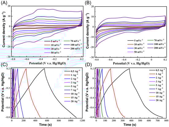(A,B) CV curves of (A) TAPT-2,3-NA(OH)2 and (B) TAPT-2,6-NA(OH)2 COFs, measured at different scan rates (mV s–1). (C,D) GCD curve of (C) TAPT-2,3-NA(OH)2 and (D) TAPT-2,6-NA(OH)2 COFs, measured at different current densities (A g−1).