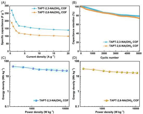 (A) Calculated specific capacitances of TAPT-2,3-NA(OH)2 and TAPT-2,6-NA(OH)2 COFs, measured at different current densities (A g−1). (B) Cycling performance of TAPT-2,3-NA(OH)2 and TAPT-2,6-NA(OH)2 COFs, measured at current density of 10 A g−1. (C,D) Ragone plot showing the energy density and power density for the (C) TAPT-2,3-NA(OH)2 and (D) TAPT-2,6-NA(OH)2 COFs electrodes.