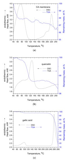 In Figure 3, the DSC and TGA curves of raw gallic acid, raw quercetin and pure CA membrane are presented. The thermal behavior of CA was recently thoroughly examined []. In both gallic acid and quercetin, the mass loss detected in TGA at around 100 °C and the respective endothermic peak in the DSC plot are related to partial decomposition, and not solely to water removal, according to the literature [,]. At higher temperatures, both decompose at around 260 °C for gallic acid and at around 320 °C for quercetin. In both cases, decomposition starts prior to these temperatures being reached. For CA, it was recently reported that the endothermic peak around 100 °C is mainly related to the enthalpy of esterification [], and at around 220 °C, the thermochemical transition occurs and is related to acetyl bond breaking.