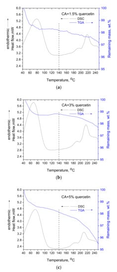 In Figure 4, the DSC and TGA curves for the CA-quercetin membranes are presented. The composite membranes exhibit qualitatively the same behavior with the pure CA membrane, i.e., one endothermic peak at around 100 °C, the thermochemical transition at around 220 °C and two respective mass loss stages. In addition, the thermochemical transition in the composite membranes initiates at (approximately) 140 °C, as in pure CA membrane, whereas from the respective TGA curves, it can be seen that this temperature is the onset for the second stage of mass loss. In Figure 4c, for the CA-5% quercetin sample, it can be observed that there is no distinction between the two stages of mass loss, and a continuous decrease in weight occurs. However, it can be also observed that at 140 °C, the mass loss rate increases.