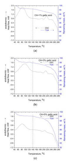 The DSC and TGA curves for the three CA-gallic acid composite membranes are presented in Figure 5. The temperature of the maximum of the peak referring to the thermochemical transition, along with the mass loss percentage for pure CA membrane and the three CA-gallic acid composite membranes, are presented in Table 2.