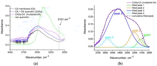 (a) FTIR spectra of CA membrane (CA), CA-5% quercetin (CA5q), their subtracted spectrum (CA5q-CA) and raw quercetin in the region 2500–4000 cm−1. (b) Curve fitting of the positive peak of the subtracted spectrum occurring in the region 3000–3750 cm−1.