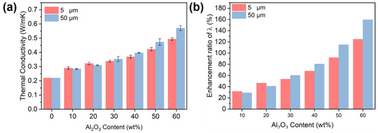 (a) Thermal conductivity (λ) and (b) enhancement ratio of λ of PC/Al2O3 composites in comparison with pure PC: influence of particle size and filler concentration.