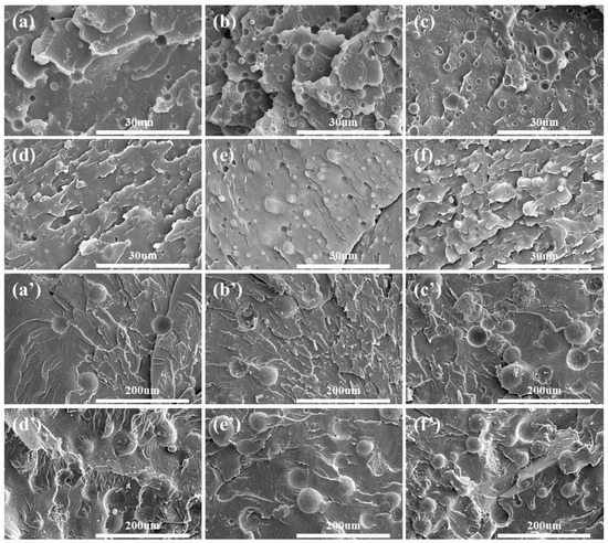 SEM images of PC/AS composites: (a) PC/AS10, (b) PC/AS20, (c) PC/AS30, (d) PC/AS40, (e) PC/AS50, and (f) PC/AS60. SEM images of PC/AL composites: (a’) PC/AL10, (b’) PC/AL20, (c’) PC/AL30, (d’) PC/AL40, (e’) PC/AL50, and (f’) PC/AL60.