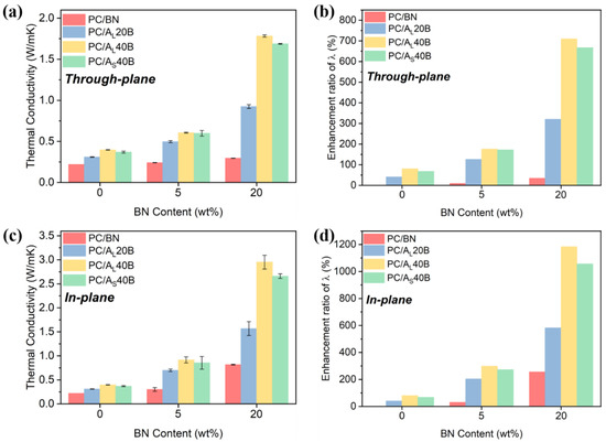 The λ values of PC/BN/Al2O3 composites, which were measured along the flow direction and perpendicular to the flow direction, are displayed in Figure 3. Figure 3a,b indicate that no significant enhancement in through-plane λ was observed for PC/BN composites and a great enhancement in in-plane λ when the BN concentration was increased from 5 to 20 wt%, which was related to the preferred orientation and increased addition of planar BN fillers in injection molded samples. Interestingly, there was a significant increase in both the in-plane and through-plane λ with the incorporation of spherical Al2O3 particles, as shown in Figure 3. For example, the through-plane λ and in-plane λ of PC/AL40B20 composites reached as high as 1.78 and 2.95 W/(mK), which were 710% and 1183% higher than those of pure PC, respectively. This was definitely related to the formation of a more compact filler network that contributed to the significant increase of λ. Moreover, the addition of spherical Al2O3 particles would, to some extent, alter the orientation state of planar BN fillers, thereby contributing to a much greater enhancement in both in-plane and through-plane λ. The influence of particle size of Al2O3 on the λ of PC/BN/Al2O3 composites was studied as well. Results showed that samples with larger size Al2O3 exhibited a much greater increase in λ, which was attributed to the higher efficiency of forming thermally conductive pathways by using larger size spherical particles. In this scenario, the use of AL particles not only reduced the contact thermal resistance between filler/matrix and filler/filler, but they also acted as bridges between adjacent fillers. Both factors contributed to a significant enhancement of λ for subsequent moldings.