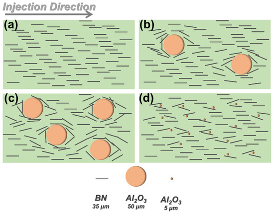 The mechanism for thermal conductivity enhancement of subsequent composites is depicted in Figure 4. As shown in Figure 4a, planar BN fillers tended to preferentially align along the melt flow direction due to the predominant shearing effect induced by injection molding. Under such circumstances, injection molded PC/BN composites would exhibit a great discrepancy between in-plane λ and through-plane λ. The preferred orientation of BN was, to some extent, impaired with the incorporation of Al2O3 particles. As a result, in addition to the presence of Al2O3 particles, the partial deflection of planar BN would increase the likelihood of constructing thermally conductive pathways across the perpendicular to flow direction, thereby leading to an increase of through-plane λ without much influence on in-plane λ. Moreover, more planar BN fillers would be deflected with the increasing addition of Al2O3 particles. In this scenario, the difference between in-plane λ and through-plane λ was minimized at higher Al2O3 loading concentrations. In addition, the size of Al2O3 particles played a role in determining the deflection state of planar BN. Larger size Al2O3 particles tended to exert a greater influence on the orientation state of BN fillers, which explained why the PC/BN/Al2O3 composites with 50 μm Al2O3 particles demonstrated higher λ than the 5 μm Al2O3-containing counterparts. As a result, the addition of larger size spherical Al2O3 particles had a more positive effect on improving the in-plane and through-plane λ of injection molded samples.