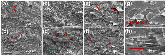 The microstructure of PC-based composites along the flow direction: (a) PC/AL40B5, (b) PC/AL40B20, (c) PC/AL20B5, (d) PC/AL20B20, (e) PC/AS40B5, (f) PC/AS40B20, (g) PC/B5; (h) PC/B20.