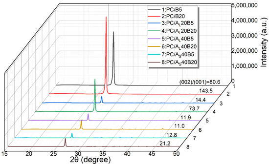 Specifically, the values of peak intensity ratio decreased with increasing content of Al2O3, provided that the content of BN and the particle size of Al2O3 remained the same. In addition, the peak intensity ratios of PC/AL/BN composites were higher than those of PC/AS/BN counterparts when the concentrations of Al2O3 particles and BN were the same. Thus, it can be concluded that both increasing the concentration of Al2O3 particles and using larger size Al2O3 led to a higher degree of deflection for planar fillers in injection molded samples, which was crucial to improving the through-plane λ of related polymer composites.