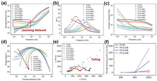 Rheological properties of PC/BN and PC/Al2O3/BN composites: (a) storage modulus vs. frequency, (b) tan δ vs. frequency, (c) complex viscosity vs. frequency, (d) phase angle vs. complex modulus, (e) 𝜂″ vs. 𝜂′, and (f) storage modulus at 0.01 Hz for different filler-containing composites.