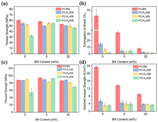The mechanical properties of PC/BN and PC/Al2O3/BN composites: (a) tensile strength, (b) elongation at break, (c) flexural strength, and (d) notched impact strength.