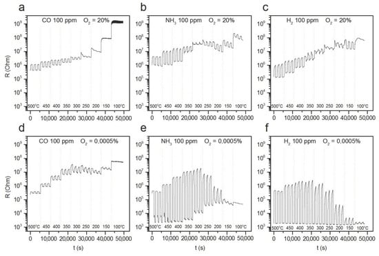 Figure 3 shows the resistance change of ZnO/Pd nanofibers with a cyclic variation in the gas phase composition during detection of 100 ppm of reducing gases CO, NH3 and H2 in atmosphere with different oxygen backgrounds of 20% and 0.0005% O2 in the temperature range 100–500 °C. The temperature dependences of the sensor response calculated by equation (1) are shown in Figure 4. Similar data for ZnO nanofibers are shown in Figures S1 and S2 in Supplementary Information.