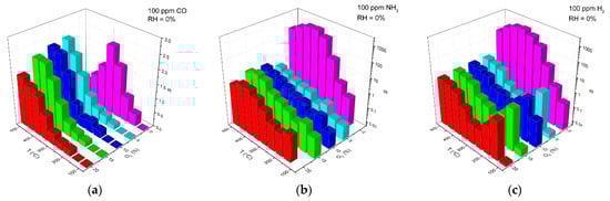 where is the sample’s conductance in background gas with preassigned oxygen concentration, is the sample’s conductance in a gas mixture containing reducing gas CO, NH3 or H2.