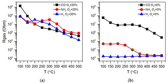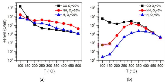 Figure 6. Temperature dependences of ZnO/Pd resistance in dry atmosphere (RH = 0%) with different oxygen backgrounds 20% O2 (a) and 0.0005% O2 (b) after interaction with 100 ppm of reducing gases CO, NH3 or H2.