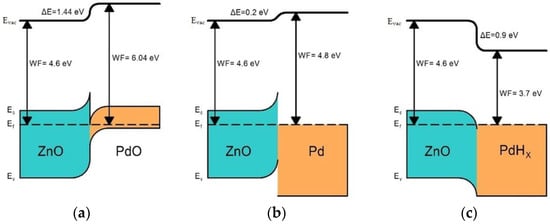 Energy diagrams of heterocontacts formed at the ZnO/PdO (a), ZnO/Pd (b), and ZnO/PdHx (c) interfaces. EC—conduction band; EV—valence band; Ef—Fermi level; Evac—vacuum level; WF—work function.
