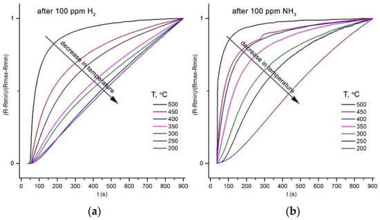 The PdH has the negative enthalpy of formation [], therefore, an increase in temperature leads to a shift of the equilibrium (5) to the left and an increase in the rate of decomposition of palladium hydride into simple substances. On the contrary, at low temperatures, the rate of the hydrogen removal is insufficient to the resistance of the ZnO/Pd nanofibers, which returns to the initial value when hydrogen is removed from the background gas during the recovery part of the sensor measurement cycle (15 min, Figure 3f and Figure 6b). This assumption is confirmed by a decrease in the rate of increase of the normalized resistance value (R − Rmin)/(Rmax − Rmin), where R is the resistance at a given time, Rmin is the minimum resistance in hydrogen, and Rmax is the maximum resistance that is reached 15 min after the hydrogen is turned off (Figure 9a). A similar decrease in the rate of resistance recovery is observed after interaction with NH3 (Figure 9b). However, in this case, a decrease in temperature also leads to a decrease in the concentration of hydrogen in the gas phase and a decrease in the amount of hydrogen absorbed by palladium clusters. As a result, achieving higher absolute resistance values in the background gas 15 min after NH3 is turned off becomes possible (Figure 3e and Figure 6b).