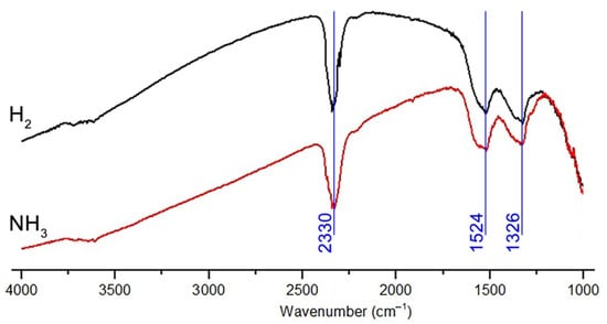 To verify the conclusion about the same mechanism of formation of the ZnO/Pd sensor response when detecting H2 and NH3 in the absence of oxygen, the study of the interaction of ZnO/Pd nanofibers with 500 ppm H2 and 500 ppm NH3 in background gas with 0.0005% O2 was carried out in situ by DRIFTS method. The full set of the obtained spectra is presented on Figure S3 (Supplementary Information). The spectra recorded after 120 min of exposure in the presence of 500 ppm H2 and 500 ppm NH3 at 350 °C are shown in Figure 10. Spectrum in pure nitrogen (0.0005% O2) was used as the baseline. An intense negative band at 2330 cm−1 indicates desorption of CO2 molecules. As discussed previously [], the nature of the two negative bands at 1524 and 1326 cm−1 is not clear [,]. It was demonstrated that the positive absorption intensity in this region increases with the increase in the partial pressure of oxygen in the surrounding atmosphere [], while the negative intensity is observed in the presence of reducing gases CO and H2 [] and increases with the increase in the heating time in high vacuum at T = 370 °C []. It can be assumed that together with the observed modulation of the spectrum base line indicating the increasing charge density in the semiconductor oxide [], the occurrence of these bands corresponds to the formation of an accumulating layer on the ZnO surface. Since there are no qualitative differences in the spectra obtained in the presence of NH3 and H2, it can be assumed that the formation of the ZnO/Pd sensor response when detecting H2 and NH3 in the absence of oxygen occurs according to the same scenario, including the following processes: (i) reduction of PdOx clusters to Pd0; (ii) spillover of hydrogen (introduced into the gas phase or formed as a result of NH3 decomposition) and its adsorption on the surface of the reduced Pd0 clusters; (iii) formation of palladium hydrides PdHx, characterized by lower electron work function compared to ZnO; (iv) formation of electron accumulation layer on the ZnO surface as a result of electron transfer from PdHx. The presence of oxygen in the background gas at a concentration of 1% or more [], the formation of palladium hydride turns out to be impossible, since hydrogen is oxidized by oxygen on the surface of PdOx clusters to form H2O molecules.