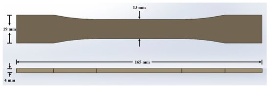 The current work is divided into two phases: the MEAM process numerical simulations and validation of numerical model results via 3DP experimental measurements. The main aim of this study is to evaluate the effect of process parameters on 3DP process quality quantified in terms of part deflections, distortions, and residual stresses. The extrusion temperature and printing resolution were varied while keeping the other process parameters, part geometry, and material properties constant. A standardized tensile testing coupon (according to ASTM D638 Type-I []) was selected as reference geometry to be fabricated using acrylonitrile butadiene styrene (ABS) material (from Ultimaker, The Netherlands). ABS provides flexibility in synthesizing nanocomposites due to its solubility in acetone [] and possesses significant physical, mechanical, and chemical resistance properties [,]. A 3D CAD model for a tensile testing coupon was generated using Solidworks 2021 (Dassault Systèmes, Paris, France), as shown in Figure 1, and imported to slicing software. The slicing information (gcode) was generated using Cura software version 5.0.0 (from Ultimaker, The Netherlands), containing information on toolpath, printing resolution, extrusion temperature, build plate temperature, printing speed, and infill type and density. The subsequent sections present the methods adopted for numerical simulations and experimentation.