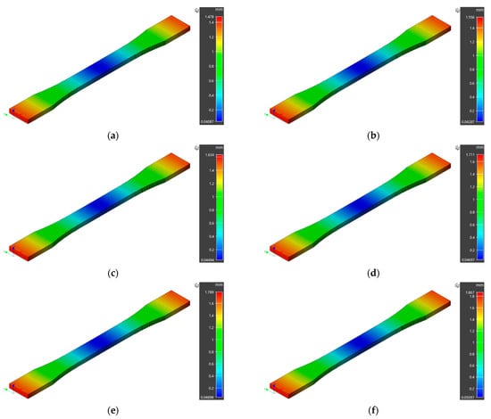 Maximum displacements in numerical model simulations at different extrusion temperatures: (a) 210 °C, (b) 220 °C, (c) 230 °C, (d) 240 °C, (e) 250 °C, (f) 260 °C.