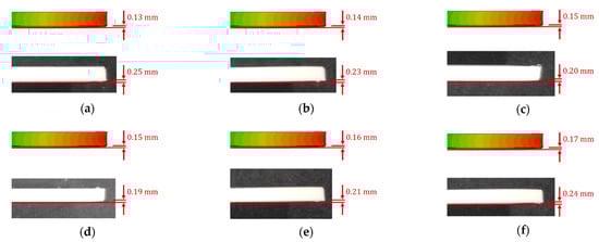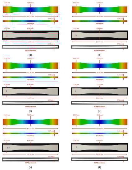 Specimen dimensions for numerically predicted and fabricated samples 3D printed at different temperatures: (a) 210 °C, (b) 220 °C, (c) 230 °C, (d) 240 °C, (e) 250 °C, (f) 260 °C.