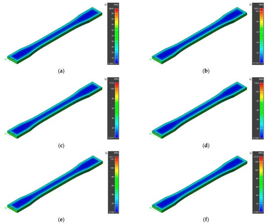 Residual stresses in numerical model simulations at different extrusion temperatures: (a) 210 °C, (b) 220 °C, (c) 230 °C, (d) 240 °C, (e) 250 °C, (f) 260 °C.
