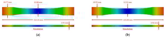 The dimensional and distortion analysis was performed on the numerically predicted results, as reported in Table 2. A significant improvement in dimensional control was achieved by reducing the layer height. A comparison of dimensions for specimens virtually fabricated at layer heights of 0.15 mm and 0.10 mm is presented in Figure 6. An overall length of 162.26 mm and 165.00 mm, grip width of 18.77 mm and 18.95 mm, the gauge width of 12.88 mm and 12.92 mm, and thickness of 3.91 mm and 3.96 mm was achieved for 0.15 mm and 0.10 mm of layer heights, respectively. Finally, a warpage of 0.13 mm and 0.08 mm was observed for specimens modeled at 0.15 mm and 0.10 mm of printing resolution, as reported in Figure 7.