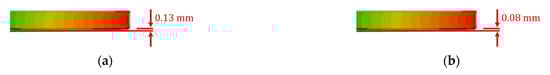 Numerically predicted warpage for 3D printed samples at different layer heights: (a) 0.15 mm, (b) 0.10 mm.