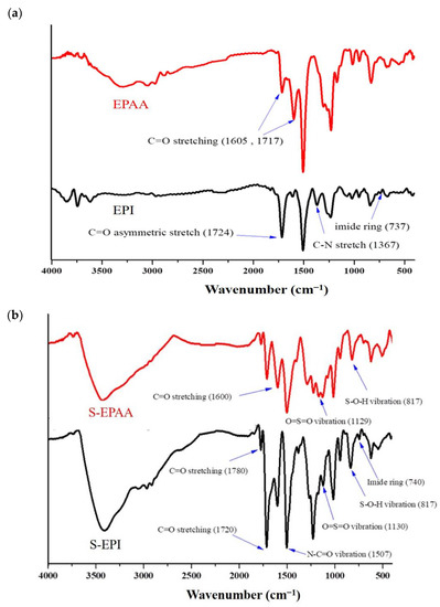 ACAT and S-ACAT were fully characterized as shown in Figures S1 and S2, respectively. EPAA/S-EPAA and EPI/S-EPI were characterized by FTIR, as shown in Figure 1. The main vibration peaks in the spectrum of EPAA in Figure 1a are the stretching vibration of the amide group (C=O) at 1605 cm−1, carboxylic acid group (C=O) at 1717 cm−1 and the carboxylic acid group (O–H) at 2400–3400 cm−1. After the ring closure of EPI, the spectrum in Figure 1a shows that the original peaks at 1605 and 1717 cm−1 became a unique stretching band of the imide ring (C=O) at 1724 cm−1, and the vibration band of the carboxylic acid group (O–H) at 2400–3400 cm−1 also disappeared. In addition, the peak for imide ring (C–N–C) also appeared at 1367 cm−1 and the bending vibration of the imide ring (C–N–C) appeared at 740 cm−1. Similarly, in the FTIR spectrum of S-EPAA in Figure 1b, the original vibration peaks of the amide group (C=O) and carboxylic acid group (C=O) were observed at 1600 and 1715 cm−1, respectively. After the ring closure of the imidized material, the peak at 1720 cm−1 became remarkably enhanced in the FTIR spectrum of S-EPI, the stretching band of the imide ring (C–N–C) also appeared at 1370 cm−1, and the bending vibration of the imide ring (C–N–C) also appeared at 740 cm−1. The FTIR spectra confirmed that the four EAP materials, namely, EPAA, EPI, S-EPAA and S-EPI, were successfully prepared.
