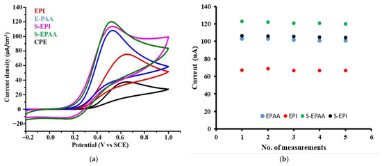 Furthermore, the repeatability of the constructed electrochemical sensor for AA detection was also investigated, as shown in Figure 3b. It should be noted that, by detection of 2 mM of AA, S-EPAA-modified CPE was found to reveal good repeatability at the stable current density of 122 μA/cm2, with the minimum relative standard deviation of 0.43%, as shown in Figure 3b. However, the S-EPI-modified CPE was found to exhibit a stable current density of ~110 μA/cm2, with the minimum relative standard deviation of 0.59%. After this testing period, the constructed electrochemical sensor was found to retain ~93–94% of its initial response, indicating that the four constructed electrochemical sensors all reveal excellent repeatability.