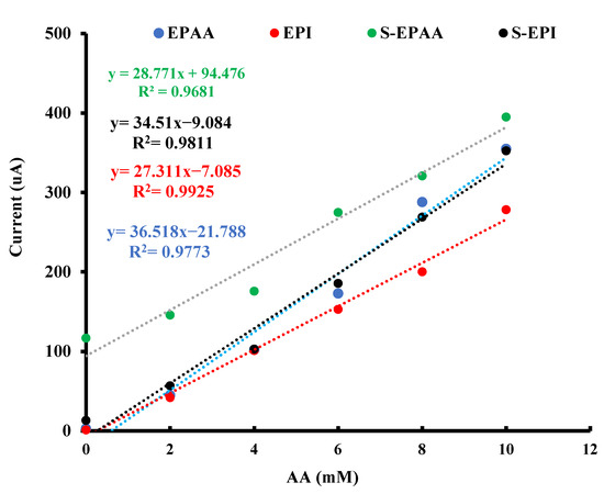 The cyclic voltammograms of the modified CPE electrodes performed at various concentrations of AA (0–10 mM) in PBS (pH 7.0) are shown in Figure S4. The detection was attributed to the reduction reaction of EPAA, EPI, S-EPAA and S-EPI and oxidation of AA. The increase in AA concentration increased the current value. Figure 4 shows the plot of the AA oxidation peak current density versus AA concentration, which indicates that the concentration of AA and oxidation peak current have a direct relationship and the slope values of 36.5, 27.3, 28.7 and 34.5 μA/mM were observed for EPAA, EPI, S-EPAA and S-EPI, respectively. These results indicate that the modified CPE electrodes effectively catalyzed the oxidation of AA.