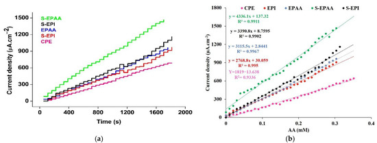 Sensitivity is a very important reference value for materials used as sensors. The fixed-ampere method was used to test the current response ability and measure the difference in sensitivity between the CPEs and CPEs modified with EPAA, EPI, S-EPAA and S-EPI. The modified CPE was placed in a homogenized stirred solution of PBS (30 mL). The chronoamperometry program was set at 510 mV, with 5 s−1 scanning frequency. Figure 5a shows the amperometric responses of the bare CPEs and CPEs modified with EPAA, EPI, S-EPAA and S-EPI, with the continuous addition of AA in the PBS solution. The as-synthesized electrode increased the current successively with the successive addition of AA in 0.1 M PBS (potential 0.51 V). Each step showed a current increase with an increment of 15 mM AA. CPE can perform detection. Only a weak oxidation current response was generated by the successive addition of AA. All other electrodes showed a higher response compared with CPE.