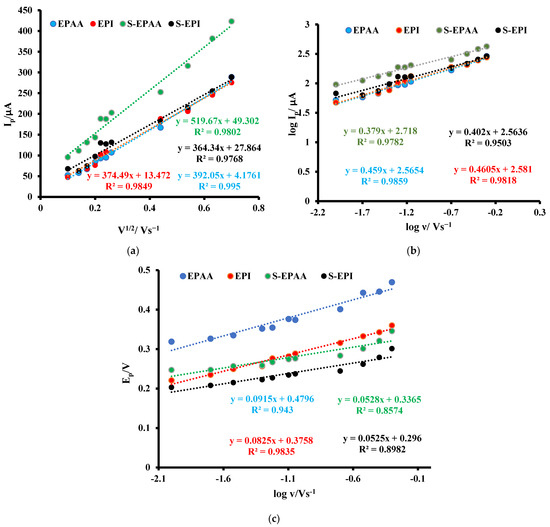 The electrode process is diffusion-controlled, as suggested by the linear plots for Ip versus υ1/2 in Figure 6a, and the linear equation for Ip was as follows: 392.05ν1/2 + 4.1762 (R2 = 0.995, EPAA), 374.49ν1/2 + 13.472 (R2 = 0.9849, EPI), 519.67ν1/2 + 49.302 (R2 = 0.9802, S-EPAA) and 364.34ν1/2 + 27.864 (R2 = 0.9668, S-EPI). From the plot of the log ν versus the log Ip (Figure 6b), the linear equations obtained for EPAA, EPI, S-EPAA and S-EPI were 0.459 log υ + 2.5654 (R2 = 0.9859), 0.4605 log υ + 2.581 (R2 = 0.9818), 0.379 log υ + 2.718 (R2 = 0.9782) and 0.402 log υ + 2.5636 (R2 = 0.9503), respectively. The slopes of 0.459, 0.4605, 0.379 and 0.402 are closer to the theoretical value of 0.5, indicating a purely diffusion-controlled process [48,49,50]. Additionally, the plot between the Ep and log υ (Figure 6c) showed good linearity, which indicates that the reaction is irreversible [51]. The regression equations obtained for EPAA, EPI, S-EPAA and S-EPI were Ep = 0.0915 + 0.4796 log υ (R2 = 0.943), Ep = 0.0825 + 0.3758 log υ (R2 = 0.9835), Ep = 0.0528 + 0.3365 log υ (R2 = 0.8574) and Ep = 0.0525 + 0.296 log υ (R2 = 0.8982), respectively.