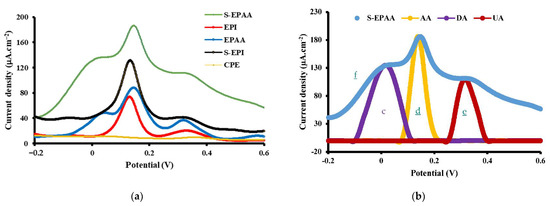 Figure 7. (a) DPV obtained with bare CPE, EPAA, EPI, S-EPAA and S-EPI-modified electrodes for a tertiary mixture of 20 µM AA/DA/UA in 0.1 M PBS and (b) DPV of 20 µM DA (c), 20 µM AA (d), 20 µM UA (e) and 20 µM AA/DA/UA (f) for the S-EPAA-modified CPE in 0.1 M PBS.