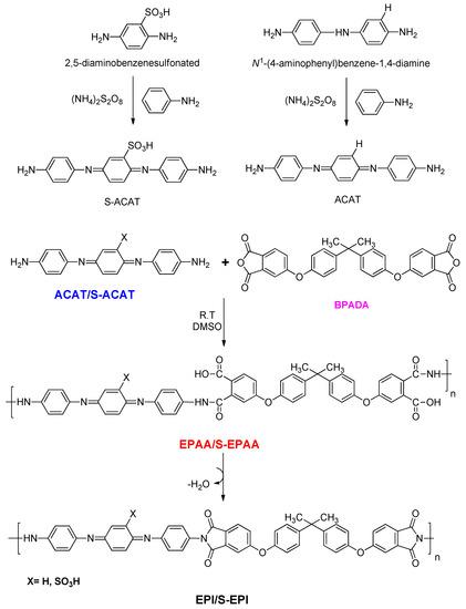 2.4. Preparation of Electroactive Polyamic Acid (EPAA/S-EPAA) and Polyimide (EPI/S-EPI)