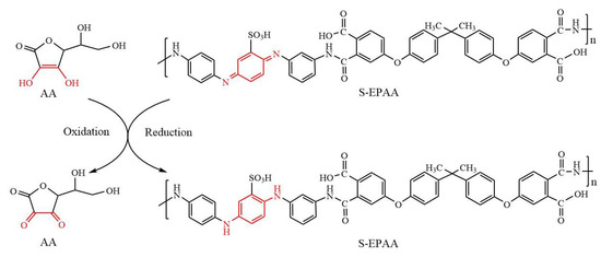 Oxidation currents were generated at the working electrodes of 2 mM AA in PBS solution. The electrode sensing ability of EPAA was better than that of EPI, and S-EPAA had better sensing ability than S-EPI. In general, the resonance effect of the sulfonate-enhanced aniline ring helps to enhance its oxidation ability, which results in better sensing ability for AA, and the best sensing ability was found in S-EPAA, which has sulfonate and carboxylic acid groups. Additionally, AA undergoes oxidation via the following mechanism, as shown in Scheme 2 [30].