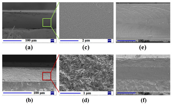 Cross-section SEM images of the membranes. (a) Pure Nafion layer; (b) SCNT/Nafion hybrid layer; (c) magnification level of pure Nafion layer; (d) magnification level of SCNT/Nafion hybrid layer; (e) pure Nafion matrix membrane after hot-process; (f) SCNT/Nafion composite matrix membrane after hot-process.