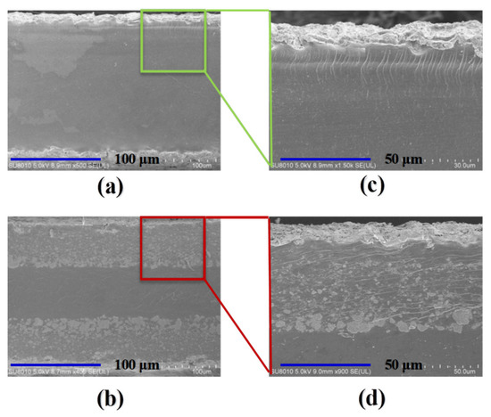 Cross-section SEM images of the IPMCs. (a) Pd-IPMC based on pure Nafion matrix membrane; (b) Pd-IPMC based on SCNT/Nafion composite matrix membrane, (c,d) magnification level of electrode and interface layer.
