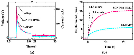 Figure 7 represents the electromechanical behaviors of the IPMCs. In the actuation current curves of both IPMCs under 2 V DC voltage (See Figure 7a), we can only observe the charging and discharging process. This indicates that the actuation mechanism of IPMCs is based on a double-layer electrostatic model [1,14,52]. The charging amount of hydrated cations at the interface electrode surfaces in the SCNT/Pd-IPMC (274 mC) was much larger than that of the Pd-IPMC (189 mC) by comparing via integrals and calculating the charging current curve for each IPMC. This is mainly considered to result from the broadly dispersed Pd nanoparticles, large surface area, and superior capacitance characteristics of the SCNT/Pd interface electrodes. We can imagine that the larger numbers of accumulated hydrated cations on the interface electrode surface will generate a larger driving force inside the SCNT/Pd-IPMC, which will result in superior actuation performances.
