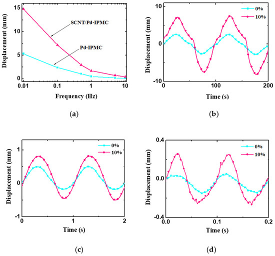 The harmonic response of the IPMCs under ±2 V sinusoidal voltage is shown in Figure 8a, the trend of which is consistent with that of the deformation under DC voltages. Figure 8b–d represent the displacement curves at 0.01 Hz, 1 Hz, and 10 Hz, respectively. Notably, the peak-to-peak displacement decreased as the frequency increased, which implies an inverse correlation between the deformation and frequency. This is the same as the trend of the capacitance-frequency dependence of the IPMCs. The reduction in deformation as the frequency increases is considered to result from the decrease in the acting time of the applied voltage at a high frequency. Even so, the harmonic response of the SCNT/Pd-IPMC is much greater than that of the Pd-IPMC and that of SWCNT-Nafion IPMC [53]. This is mainly attributed to the formation of the SCNT/Pd interface electrodes, which effectively enlarged the available contact areas, and also shortened the hopping distance for the hydrated cations in the intermediate layers [54].