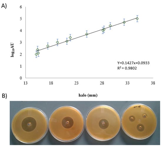 (A). Nisin standard curve by agar diffusion assay. (B) Agar diffusion assay image to represent the diameter of the inhibition halo.