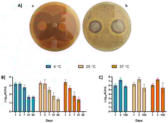 Figure 2A shows the qualitative agar diffusion test of N–BC against L. sakei (Figure 2(Aa)) and S. aureus (Figure 2(Ab)) after 7 days of storage at room temperature. Additionally, the quantitative tests of stability against L. sakei and S. aureus are shown in Figure 2B,C, respectively.
