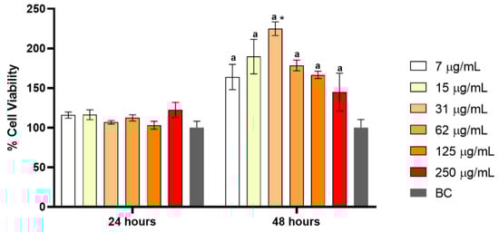 Cytotoxicity of nisin loaded in bacterial cellulose (N–BC) at concentrations of 7, 15, 31, 62, 125 and 250 µg/mL.; a p < 0.05 if compared to the respective concentrations at 24 h. * p < 0.05 if compared to the concentration of 7 µg/mL at 48 h.
