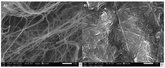 Scanning electron microscopy of the bacterial cellulose (BC) (A) and the bacterial cellulose loaded with nisin (N–BC) (B), at 15,000× magnification.