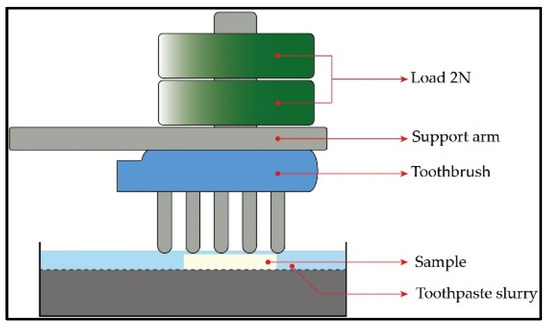 Wear was evaluated by applying the tooth brushing test using automatic tooth brushing equipment (MEV 3T-10XY; Odeme Dental Research, Luzerna, Brazil). Hard bristle nylon brushes (Colgate Extra clean; Colgate–Palmolive, Bogotá, Colombia) were used on each brush head under a load of 2 N in a direction perpendicular to the sliding surface. Brushing was performed at a frequency of 1.2 Hz for a total of 100,000 cycles. A suspension of 150 g of toothpaste (Colgate Total 12; Colgate–Palmolive, Colombia) was injected with 1 L of distilled water every 5000 cycles to ensure that the surface remained moist. The mixture was stirred evenly before each addition to prevent particles in the toothpaste from settling to the bottom. The test was carried out at room temperature. At the end of the brushing test, each sample was cleaned with running water and dried with compressed air. (Figure 1).