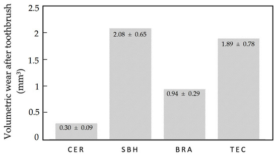 The most common monomers used in dental resins are triethylene glycol dimethacrylate (TEGDMA), urethane dimethacrylate (UDMA), bisphenol A glycol dimethacrylate (Bis GMA), and 2-hydroxyethyl methacrylate (HEMA) [35]. It has been observed that composites with TEGDMA absorb more water and create a more flexible polymer network, while those containing UDMA and Bis-EMA absorb less water and create stiffer networks. Bis-GMA leads to the formation of the stiffer network, which absorbs less water than the resin made by TEGDMA, but more than the resins made by UDMA and Bis-EMA [36]. Şen et al. evaluated the effects of immersion in food-simulating liquids and tooth brushing on the surface of dental materials, whose association between these chemical and mechanical processes have shown clinical relevance, presenting chemical degradation on Bis-GMA molecules [37]. In another study in which surface changes in composite materials were evaluated in relation to brushing time, it was concluded that a brushing time of 10 h was required to evaluate the potential for deterioration [38]. In the present study, during the simulated brushing, the specimens were exposed to a solution of distilled water and dentifrice at room temperature for a time of 10 h (100,000 cycles) (Figure 1), so it could be hypothesized that there was higher wear of the materials that presented Bis-GMA and TEGDMA in their composition, corresponding to SHB and TEC. This relationship between the higher volume loss in the wear of materials that presented TEGDMA in their composition was reported in another study [39]. Moreover, in the case of SHB, it can be hypothesized that the absorbed water would cause hydrolysis of the interfacial silane coupling agent, especially in the case of zirconium silicate which does not silanize effectively due to its high crystalline content [40]. The information provided by the BRA manufacturer on the composition of the CAD/CAM composite is so modest that, in this respect, no comparisons can be made.