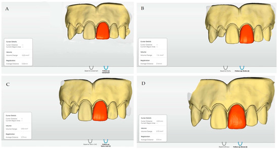 Result of the initial scan and post-wear scan overlay in the Oracheck software 5.0: (A) Cerasmart (CER); (B) Shofu Block HC (SBH); (C) Tetric CAD (TEC); (D) Brava (BRA).