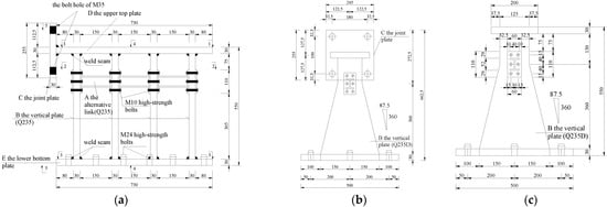 As shown in Table 1, the paper divided the test into four groups according to the variables of the web thickness, the alternative link height, and the installation position of the alternative link, and a total of four specimens. All of specimens underwent a low-cycle cyclic reciprocating loading test. The overall structure of the specimen is shown in Figure 3. The production process of retainer specimens is as follows: each part of the main body of specimens is formed by steel plates of different thicknesses being cut and then welded. Specifically, the alternative link is welded into a whole and then is connected by the vertical plate of the test piece through high-strength bolts.